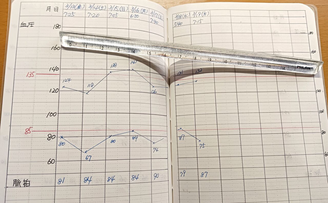 固定して不自由にならないために みなさん、百も承知のとおり、これまでこのブログは日曜日は更新しない『定休日』にしていた(でも、そのように定めたのは去年の11月のことで、まだ半年も経っていない)。 しかし、私は思った。 逆に平日に休みたい気分になることもある。 そういう不測の事態、抑えきれない欲求に備え、定休日なんかを設けず、いつだって好きなときに休めるようにしてはどうか、と。 いや、力んで言うような立派な思いつきじゃ、全然ないが。 ということで、今後は日曜日定休を廃止し、不定休に改めることに決めた。 とは言っても、いまのところあまり休むことはないと予想している。 最後の一滴まで無駄にしないために ところで、みなさんはふだん目薬を使っているだろうか? 私はふだんから使っているとは言わないが(毎日必ず1回以上はさすってほどではない)、でもほとんど使わないってほどでもない。 そんな頻度なものだから、なかなか減らなくて、ついにはまだ少し残っていても捨ててしまうというのが常である。 ところが、今回はきちんと使い切った。 目薬を使い切るなんて、わが人生で初めてのことかもしれない。少なくともこんな達成感を味わった記憶が過去にはない。 グラフの上がり下がりをあいまいにしないために ところで、みなさんはふだん血圧を測っているだろうか? ご存じのとおり、高血圧(および頻脈ならびに高脂血症および高尿酸血症)で通院している私は、以前とは心を入れ替え毎日血圧測定をしている。 しかし、これまで使っていた血圧手帳は最後のページまで使い切ってしまった。 そして、いまでは病院で無料で血圧手帳をくれることがなくなった。 では病院で有料で買えるのか?というと、買えるのかもしれないが、でも「お買い求めになられますか?」と言われる兆候はまったくない。 そこで私は、自分で血圧手帳を作ることにした。 グラフのプロットがしやすいように、1mm 方眼のノートを探したが、ヨドバシカメラでも Hands でも紀伊國屋書店でも、1mm 方眼の A6 サイズのノートを見つけることができなかった。 そこで Nakabayashi の「ロジカルノート」にした。方眼ではないが1行に3分割のガイドラインが入っている。 すべて手作業で枠を書いたりしなければならないが、これまたボケ防止に寄与するのではないかと前向きに考えている。 なお、これまで使っていた病院からいただいていた血圧手帳(高血圧管理手帳)は、このような中身だった。 |