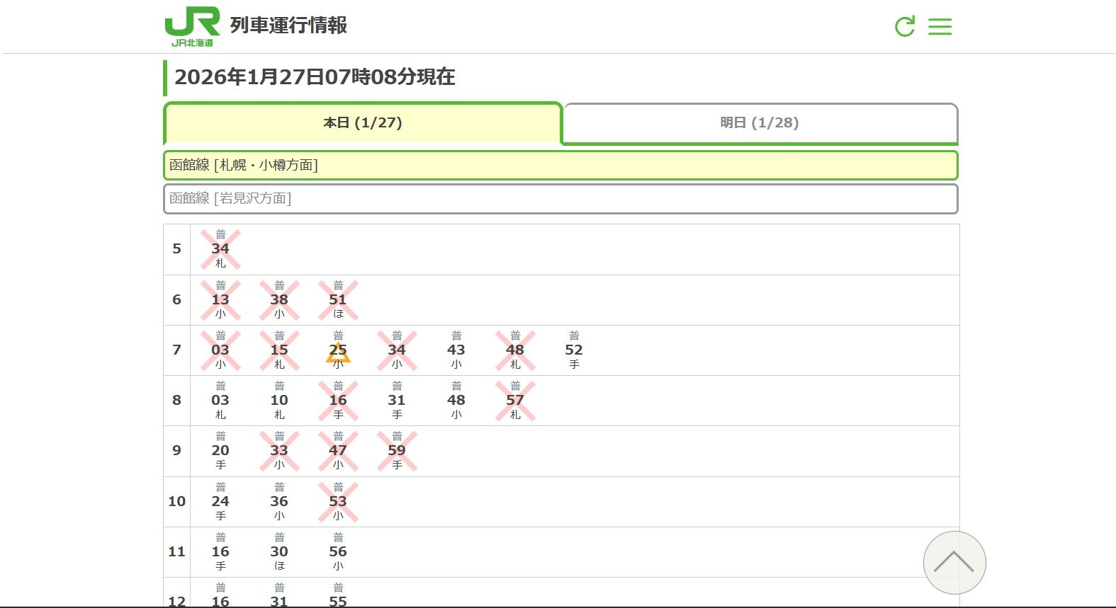 JR の運行情報の『各駅運行情報』の札幌駅(岩見沢方面)を見ても、『X』印がついた列車は一つもなかった(すでに21時以降は運休とアナウンスしているにもかかわらず)。