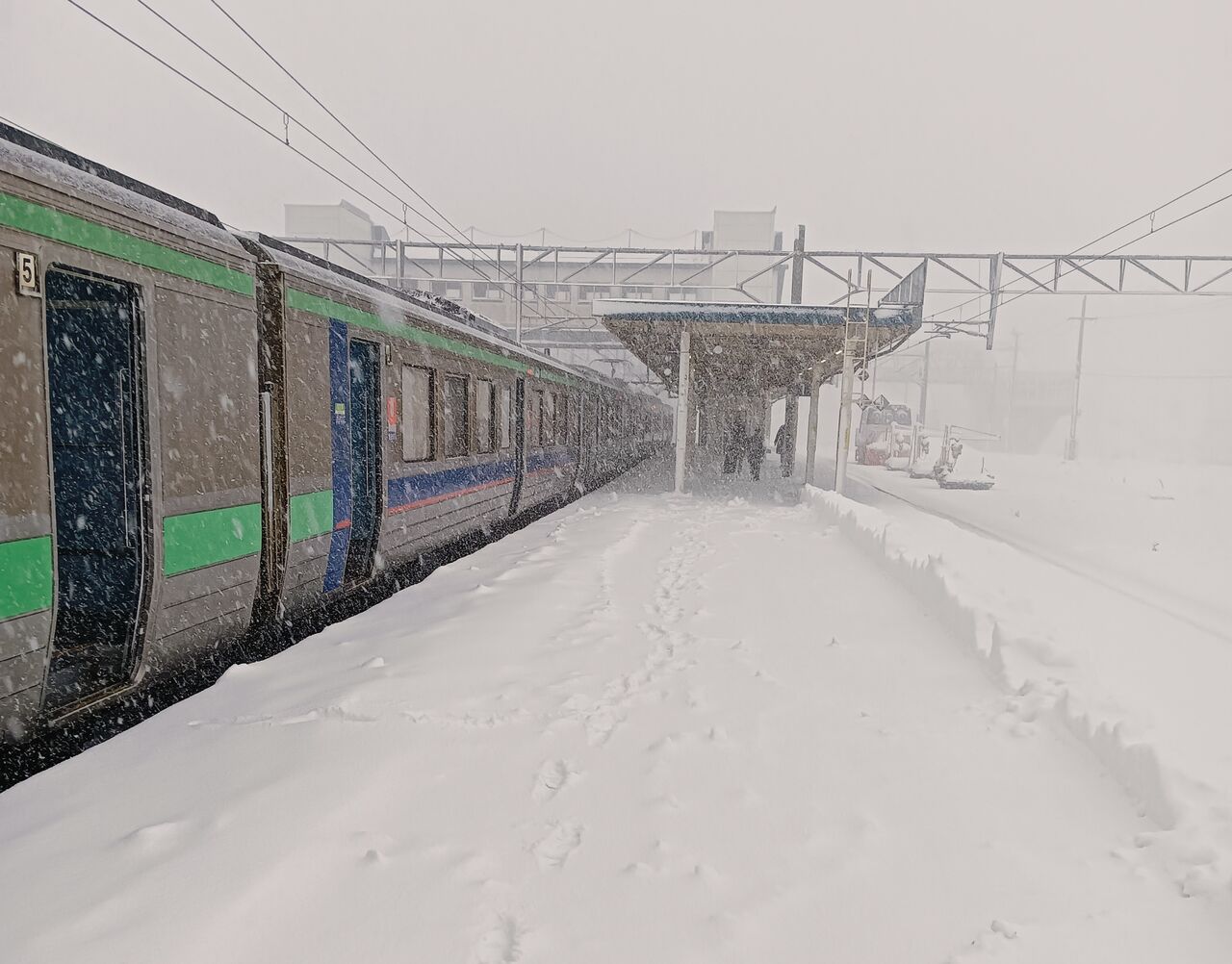 11月なのに大雪警報って? おとといの朝。 「はぁ? 」って不機嫌な顔で言いたくなるほど、雪が降っていた。 運悪く、この日は出社日。 通勤のために外へ出ると、積雪量は思った以上。 しかも、まだこの時期なので、車道も歩道も市の除雪は入っていない。 けもの道のように足あとがついたところを歩いていくしかなかった。 幸い JR の電車の運行の遅れは無し。 が、不幸なことにホームの除雪も追いついておらず、私が利用する先頭車両のあたりはドアの前も雪深いままだった。 でも(ってことはないが)、この日乗ったのは721系のクモハの第1号車。 721系電車がデビューしたのは1988年なわけで、この車両は37年目ということになる。 この車両のように私も雪に負けずにがんばらねばと思った(ちょこっとだけ)。 最近は721系が普通列車で運行されていることが増えた。 老朽化しつつあるこの形式の車両は、快速「エアポート」での運用から外されて普通列車での運用に回されているようだ。快速「エアポート」は733系が主流になってきているのだろう。 座ることができたときには、クロスシートの721系の方が断然乗っていて楽だが。 札幌駅から外に出ると、全然雪が積もってないことに驚く。 石狩って広いのね…… 会社に着き、ほどなくするとスマホにメールが入った。 大雪警報? 11月に? まだ、家の基礎の換気口も閉めていないのに? 江別駅に近づくにつれ視界悪化、積雪増嵩 用務をちゃちゃっと済ませ、雪のない歩道を軽快に歩いて札幌駅に向かう。 幸いダイヤは乱れておらず、乗った江別行き普通列車は定刻に発車。 苗穂駅。 雪は積もっていない。降ってもいない。 繰り返しの言い訳になるが、写真がぼやぁ~としているのは電車の窓ガラスの透明度が低いためである。 森林公園駅(まだここは札幌市内)。 少し積もっている。雪も降り始めた。タワマンがはっきりとは見えなくなってきている。 大麻駅(江別市に入った)。 さらに積雪量は増えた。雪も降っている。 野幌駅の手前。 コープさっぽろのっぽろ店の隣、無印良品の横に建てている白い建物は何になるのだろう? コープさっぽろのっぽろ店の野幌駅側の駐車場内にはモスバーガーができた。モスと謎の白い建物が建ったことで駐車場が狭くなっていくが支障はでないのだろうか?(屋上駐車場はない) 野幌駅。 大麻駅あたりより、積もっている雪の量はさらに多い。降り方も強くなってきた。 ところで、何が建つんだろう? 電車が江別駅に着くと……どひゃあ~ なんじゃこれ。 駅から家へ向かう道、特に江別駅南側の「駅裏通」は足あともほとんどない『新雪状態』。 膝まで足が埋まる、とまではいかないものの、ふくらはぎは急速冷凍中の環境にさらされ続けた。 セコマに豚丼なく、ローソンで豚丼発見 セイコーマートに寄る。 ホットシェフの弁当で冷え切った心とふくらはぎを温めたかったのだ。 でも時刻は10時半。ビミョーだ。 やっぱりお目当ての豚丼はなかった。 ホットシェフの厨房で調理していたおじさんに豚丼はあとどれくらいでできるか聞く。 1時間ぐらいかかるという。 これじゃどうしようもないので店を出て、外で店の入り口上の庇の雪を棒で突っついて落としているバイトのお姉さんと「札幌は全然降ってなかったですよ」「ホントーですかぁ?」と、なんとなくセコマだからこそできる感じがする地域コミュニティ的会話を交わしたあと、私は信号を渡ってローソンに入った。 たまたま「LAWSON 店炊きごはん」の「炭火香る帯広名物豚丼」が1個残っていたので、「へぇ~、こんなんあるんだ。残っててラッキー」とばかり、買ってみた。 うな重のように山椒の粉をかけて食べたがおいしい豚丼だった。 最後は歩くのもやっと 午後は勤務時間中にもかかわらず、雪かき&雪運び。 すでに隣のご主人と、そのさらに隣のご主人が活動を開始していて、雪を捨てる空き地へのスロープも出来上がりつつあった。 私も雪を運び、スロープ作りに加勢した。 が、大量で重い雪のせいで、作業の終盤は両脚のつけ根が傷み始め、太もももすねもだるくなった。 作業は2時間に及んだ。 脚のつけ根の痛みは、翌日もさらに続いた。 早く体を除雪モードに慣れさせなくては…… なお、この日の江別の積雪は45センチくらいになったそうだ(18日18時までの24時間降雪量)。 札幌も中央区あたりはほとんど降らなかったが、北区のあいの里あたりは35センチほど降ったという。 |