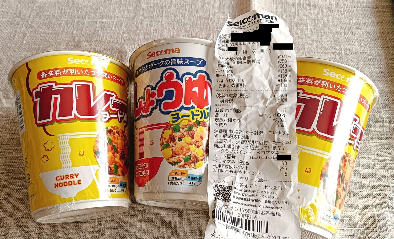昨日の記事の続きであり、堂々の完結編である。 3月3日(火) 午前中、第一生命の地区担当(セールスレディ)から電話がかかって来た。 実は1カ月ほど前に第一生命の(本社かどこかは知らないが)お客さまサポート係だかなんだかから電話が来た。 その人が言うには、妻が加入している払い済み保険について「契約内容ご案内制度と保険契約者代理特約」が付加されていないので、付加しませんか?無料ですから」ということだった。 無料なら付加しておくことに越したことはない。 だが、家にセールスレディが来るのは、またあらたなご提案など望んでもいないことをされそうなので、手続きの書類を郵送してもらうことにした。 ところが、この日の電話は「郵送手続きができない。本社の説明が間違っていた」というものだった。 じゃあしょうがないということで、午後に来てもらい、手続きをした(この日の昼は妻が作って置いていってくれたおにぎりを食べた)。 すべてレディさんが持ってきたノートパソコンの画面で手続きが終わった。 過去、すでに指定代理請求特約は付加していたが(上で『付加済』と文字を挿入したのは私である。こういう書類が作られてきたわけではない)、今回付加した2つはなぜほったらかしになっていたのか? どうやらこの2つは最近になってできたもので(といってもすでに何年か経っているらしい)、指定代理請求を付加したときにはまだなかった制度・特約らしい。だから知らないまま放置していたのだ。 レディさんは、あらたに個人年金保険の保障設計書を持ってきた。 受け取るだけ受け取った。 だから、こういうのがいやなんだって。 まっ、向こうも仕事だからしかたないか。 3月4日(水) 10時過ぎに「V1」が届いた。 それを受け取ったあと、スーパーマーケットに散歩がてら買い物に。 昼に食べようと、レトルトの「麻婆丼」の具も買った。 豆腐入りと書いているが、豆腐の姿はごくごくわずか。 そっか。 「麻婆丼」と書いてはあるが『麻婆豆腐丼』とは書いてないわけだから、看板に偽りはない。 それにしても、なかなかの辛さだった。 子どもには無理だ。 自分が年寄りでよかった。 食後、水を飲もうと冷蔵庫を開けると、前日の夜に買ったセコマの「麻婆豆腐」が。 買ったことを忘れていた。レトルトを買う必要はなかったわけだ。やれやれ。 午後はまたまたブログの書きだめ。 夕食は前夜に買ったセコマの麻婆豆腐(一人前だけど)。 また、鶏のもも肉を焼いて、その上にチーズを乗せて食べた。 3月5日(木) 新聞に「ホクレンショップ」の折り込みチラシが入っていた。 5日は Go!Go! Day なのだ。 橙野さんも「ホンコンやきそば」好きで、3日の夜もホンコンやきそばの話題になったのだが、今日明日は税別59円で売られることを教えるために、この写真を LINE で送った。 「ホンコンやきそば55円はお得ですね」という、しごくまっとうな返信が来たに過ぎなかった。 午前中に郵便でこれまで会社で加入していた健康保険の任意継続の案内の書類が届いた。 そう。 退職後、国民健康保険ではなく会社の健保組合の健康保険を任意継続することにしたのだ。 保険料も、私が計算したところ、江別市の国保よりもひと月当たり2,500円ほど安い(今年の場合)。 マイナポータルでマイナ保険証を確認してみると、ちゃんと新しい『記号・番号』に切り替わっていた。 で、さっそく保険料を振込みに銀行へ。 この日、妻は仕事が休みだったが、友人とランチへ出かけた。 では私は昼に何を食べようかと考えながら、銀行帰りに LAWSON に寄ってみたら「竹老園のかしわそば」が売っていたので、久しぶりに食べてみたくなって買った。 おいしかったが、このときに比べてずいぶんと値段が上がったものだ。 午後は外に出て、庭の桃色ナツツバキの枝を払った。 この木はわが家のシンボルツリーであり、かつてはポーポーちゃんが営巣し子育てしたこともある思い出深い木だが、毎年カイガラムシが発生し、蟻が幹を行き来し、さらには黒すす病で見た目が悪くなっているので、もう少し暖かくなったら伐採しようと考えている。 その下準備として芽吹き始めている小枝を払った。 夕食の調理担当は私。 ラーメンサラダを作ってみた。 また、妻が江別蔦屋書店の「NaNa 7」で買ってきた「特製ミートソースのドリア」も食べた。 3月6日(金) 前日のご飯の残りがあったので、朝はレンジ飯ではなく、お粥を作った。 メインのおかずは「卵味噌」。 少量の水にみそを入れて溶き、さらに卵を入れてかき混ぜる。それをレンジアップすると出来上がり。 他には、梅干し少し、海苔とかつお節、塩昆布。 胃腸には良さそうだが、すぐに空腹になるのが難点だ。 この日で、退職日からまる一週間。 ってこととは関係ないが、朝、勤めていた会社の人からメールが来た。 返却した会社貸与のスマホのことで確認事項があったのだ。 問題は無事解決。 昼前には「いまお使いの au ひかりの料金が下がるご案内です」