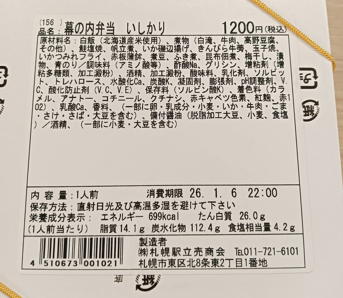 25分の乗車時間でもがっつり倒す人 この日も 130M 列車はエアポート編成。u シートに着席して出勤。あまり気にはならないけど、でも朝からがっつりリクライニングを倒すのってどうなのかなと思う。私は倒さない。こういうのを躊躇せずにやる人ってだいたいはおっさん(といっても、私よりは若いはずだ)か、意外なことに学生らしき女性。 ええ、正月中は私、鮭もさやえんどうも食べましたです この日は札幌駅に着いたら改札内にある弁菜亭の「 ラッチ南店」に行って駅弁「幕の内 いしかり」を買うことを心に決めていた。 思い起こせば、 いまから6年ほど前に現在の会社に勤めるようになり、ときどき買っていた当時の「いしかり」の値段は850円。それがいまでは1,200円。およそ4割も上がったことになる。 材料費や人件費がそれだけ上がったということ。異常な物価高が続いているが、この先年金暮らしの私たちの生活はどうなるのだろう? 「知床とりめし」が買えなくても、代わりとしてなぜ前日に「いしかり」にしなかったのか? それは「いしかり」の中身が、煮豆やすき焼き風の煮物、玉子焼きに赤板蒲鉾と、なんとなく既視感のあるおかずが多く、正月休み明け初日には食べたくなかったからだ。その既視感って何かというと、『おせち』である。お節料理に類似するものは回避したかった。