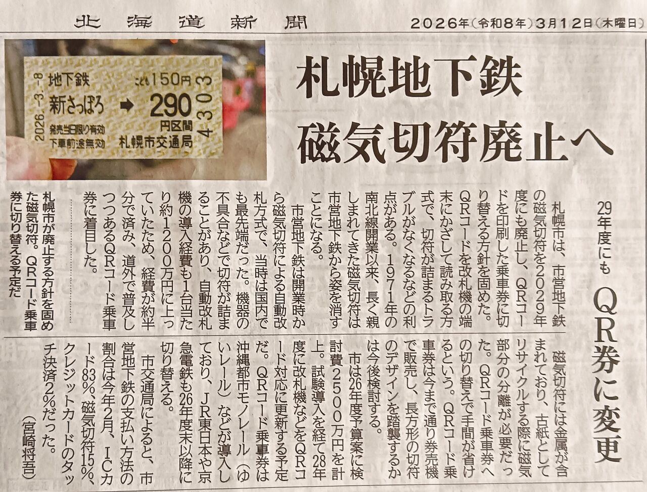磁気切符が廃止に ちょうど一週間前の木曜日の北海道新聞に、札幌市営地下鉄の切符を Non 磁気のものに変えるという記事が載っていた。 そういえば高校生のころに使っていた定期券がどこかにあったなぁと思い、探すとあった、あった。 高校2年生のときのものだ。 懐かしい。 念のために書いておくが、 "52" というのは、昭和52年のこと。西暦だと1977年ってことになる。 区間は手稲東中からだが、実際には西野ターミナルから乗車し、西28丁目駅で地下鉄東西線に乗り換え、バスセンター前駅で降りるかと思いきや、実は大通駅で降車しバスセンター前駅の出口1番から出た方がバスセンターの市営バス丘珠線の乗り場に近かったので大通で降り、『中沼小学校通』行きのバスに乗って通学したものだ。 ちなみに、当時の札幌市営バスの塗装はこんなんだった。 JR 北海道も磁気切符だけど、この先どうなるんだろう? 非公開のまま誘って来ないで 午前中のことだが、インスタグラムで新たに私をフォローしてくれた人がいた。 写真を見る限りでは、若い金髪の外国人女性である。 が、"プロフィールは非公開です" となっている(しかもフォロワーはゼロ)。 非公開なためにどんなことを書きどんな写真をアップしているのかわからないままの人を、どうしてフォローバックできようか?私にはできない。 でも、非公開なのにこのように私をフォローしてくる人って、今回に限ったことじゃなく、少なからずいる。 どういう目的、意図、狙い、策略なのだろう? この日の昼は、前日の夜にゆでたひやむぎが少し残っていたので、にゅうめんに。 『新しい男』っていうことではなく、そうめんやひやむぎを温かくして食べるのをにゅうめんという。なお、私はそうめんはあまり好きではない。 残っていた麺だけでは足りないので、餅を2つトッピング。 なぜか波があるオークションの落札 翌日は『13日の金曜日』。 といっても、13日の金曜日だからなんなのさっていう人が、いまでは大勢のよう。 イエス・キリストの最後の晩餐で、13人目に着席したのが裏切り者のユダであったことや、キリストが十字架にかけられたのが金曜日だったので、13日の金曜日は不吉とされるのだが、いずれにしろ「今日は13日の金曜日だね」と言って、「ジェイソンですね」と返してくる人がいたなら、その人はだいたいにおいて若者ではないだろう。 午前中に『スマートレター』を買いにセイコーマートへ。 オークションに出品していた CD が2枚落札されたので、その発送用。 不思議なもので、オークションに出品していても、まる1カ月まったく落札されないこともあるのに、立て続けに落札されることもある。今回は、立て続け状態だった。 セコマでは、翌日がホワイトデーだということもあってデザートも購入した。 昼はこのときに買ったセコマのカレーヌードル。 夕食は私が調理担当。 豚肉と玉ねぎの炒め物、水菜と塩昆布の和え物を『製作』。 手前の小皿に乗っているのは前日のサーモントラウト(トラウトサーモンだったかもしれない)の刺身の残りをバターで焼きガーリックパウダーとしょうゆで味付けしたもので、想定以上においしく出来上がった。 14日の出来事 ――サギ集団を見たことなど―― はすでに報告済みなので、今日のところはこのへんで。 ♪ MUUSAN の今日の一曲 ♪ シューベルト(Franz Schubert 1797-1828 オーストリア)のピアノ五重奏曲イ長調O.114,D.667「ます(Die Forelle/Trout)」(1819)。 |