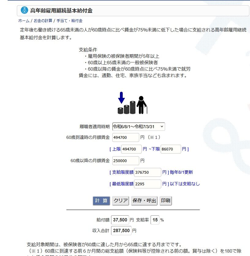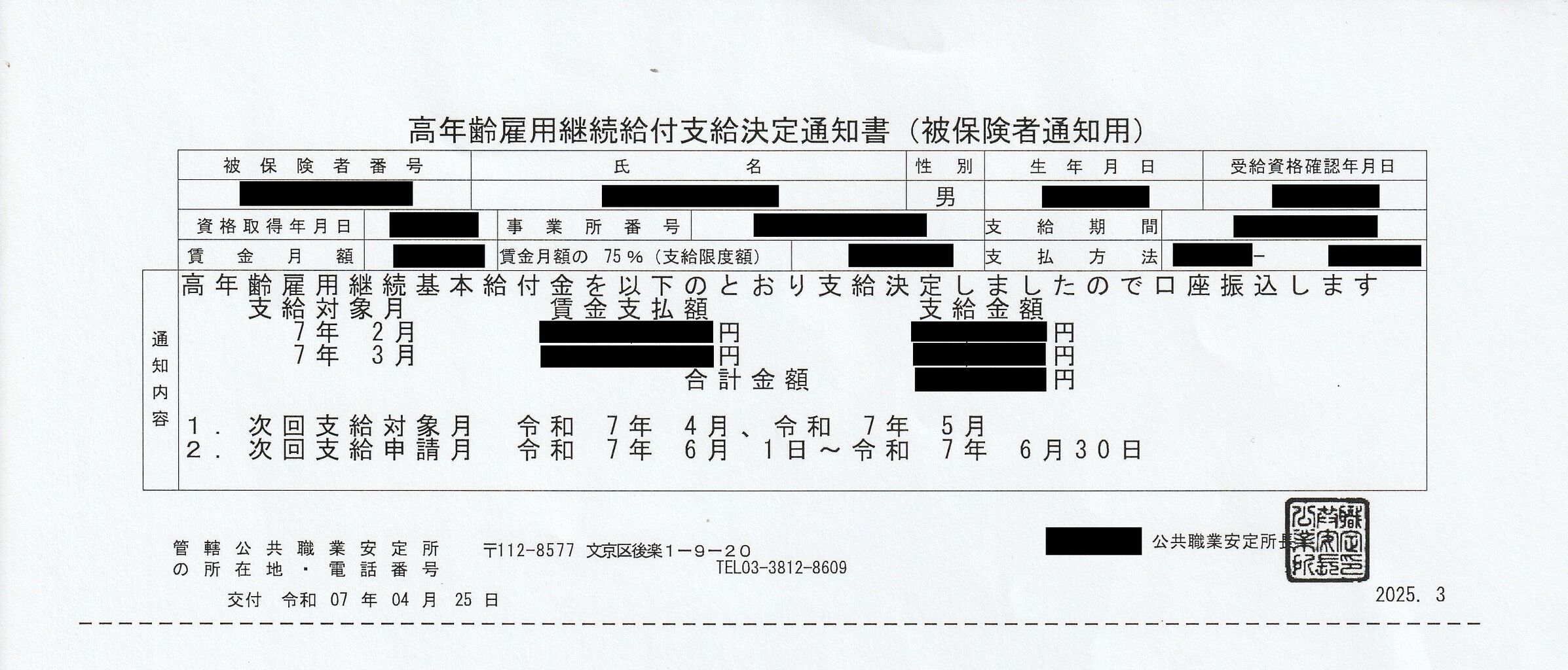![]() ![]() 一度そう見えてしまうと 今日から6月である。 ということは、『好ましいとは言えない顔』に見えるあのイラストから解放される。 とてもほっとする。 いや、そんな風に見える私の方に問題があるのだ。 けど、一度そういう風に見えちゃったら、エブリディ、エブリタイム、そういう風に見えてしまうのである。 それは2階のトイレの壁にかけてある卓上サイズのカレンダー。 フランス在住のイラストレーター Yukiko Noritake が描いた『Art de vivre』というカレンダーだ。 5月のイラストは、ワンちゃんたちが並んでいる後ろ姿を描いた、ほのぼのとするもの。 しかし、私にはあれが顔に見えてしまったのである。 右から2匹目の白いワンちゃんの後頭部。 ごく普通の後頭部だ。 しかし、顔に見えちゃったのである。 それも、なんとなく怖い感じの顔に…… でも、それも今日からは別なイラストになる。 6月になったから。 なんとなくほっとしている。 奇数月だが支給されたのは初回分だから ところで、5月に私に初めての特別支給の老齢厚生年金が支払われた。 第1回目の支給である。 年金は偶数月に2カ月分が支払われるが、今回5月なのに私に支払われたのは、支給開始月が3月分からだったから。 6月には通常通り4月分と5月分が支給されるはずだ。 なお、今回は「高年齢雇用継続給付金」受給に伴う年金の支給停止額がマイナスされていない。 次回調整される(引かれる)のだろう。 しかし、そのときから在職老齢年金制度による年金停止額の調整額が変わったため、試算時よりも停止額が減少し、それよりは多く支給されたことはありがたい。 参考までに支給額の試算例 その計算の仕方を参考までに書いておく。 あくまで年金額や総報酬月額相当額は例としての数字。 実際の私自身の金額ではないので念のため。 老齢厚生年金の基本月額は100,000円とする。 総報酬月額相当額 (勤務先の給与(各種手当や通勤費等含む)とイコールと考えてほぼ間違いない)の月額は、250,000円とする。 この場合の在職老齢金制度による年金停止額を計算してみる。 私が定年退職した令和2年のときは支給停止調整額は280,000円だったが、令和7年度では510,000円になっている。 在職している場合の年金の停止額の計算式は、 (老齢厚生年金基本月額+総報酬月額相当額-支給停止調整額)÷2 これに令和2年時点の支給停止調整額を当てはめて停止額を求めると、 (100,000+250,000-280,000)÷2=35,000 ということで35,000円が支給停止。実際に支給される年金月額は、 100,000-35,000=65,000 になる。 しかし、令和7年時点での支給停止調整額で計算すると、 (100,000+250,000-510,000)÷2 の結果はマイナスとなるため、支給停止額は0円となる。 つまり、月額100,000円の年金がそっくり支給されることになる(所得税は引かれるが)。 この計算例と同様に、私の場合も令和2年時点での試算で「えっ?こんなに減額されるの」と悲しんでいたのが、支給停止調整額が変わったことで今回停止額はゼロになったのである。 世の中の実態に合わせて支給停止調整額が見直されたことは、まったくもってありがたい。 また高年齢雇用継続給付金についても、令和2年の時点では私には支給されなかった。 というのは、60歳到達時の月額賃金の上限額と60歳以降の月額賃金との兼ね合いで計算結果として支給額がゼロとなったのである(私の場合、江別に戻って来て、賃金に含めてカウントされる通勤手当の額が大きくなったのがネックとなった)。 この上限額は毎年8月に更新され、2年前にようやく私にもわずかながら支給されるようになった。 今年度の私の給与の契約金額は、特別支給の老齢厚生年金が支給され始めることから、大きく下がった(この会社に雇用してもらうときに、最初からそういう約束だったのだ)。 給与が下がるということは、60歳到達時の月額賃金との差がさらに広がるわけで、高齢者雇用継続給付金の支給額は大きくなった。 高年齢雇用給付金支給による年金の停止額――それは在職老齢年金制度による停止額(上の例ではゼロ円)に加えて停止されるが――は、最大で総報酬月額相当額の6%となる。 令和7年3月以前に60歳になった人の場合で、60歳以降の総報酬月額相当額が上の例の250,000円、60歳到達時の月額賃金が上限額の494,700円だった場合(494,701円以上だったとしても494,700円で計算する)、この「Keisan」サービスでシミュレーションすると高年齢雇用継続給付金の支給額は最大支給率の15%の37,500円となる。 この給付金による年金支給停止額は、総報酬月額相当額の6%(年金支給の停止の割合は雇用継続給付金の4割なので、支給率15%の4割の6%)の250,000円×6%=15,000円となる(=37,500×40%)。 なお、令和7年4月以降に60歳の誕生日を迎える人は、高年齢雇用継続給付金の最大支給率は10%になる(上の計算シミュレーションサイトでも、適用時期を『令和7/4/1~』にすると、支給率が最大で10%となるので、令和7年3月以前に60歳になった人は注意が必要。その一つ前の適用時期(令和6/8/1~令和7/3/31)でシ