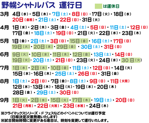 野幌駅シャトルバスの運行日について(2026年)野幌駅発着のシャトルバスは、すべての試合日に運行されるわけではありません。 特に以下の点には注意が必要です。