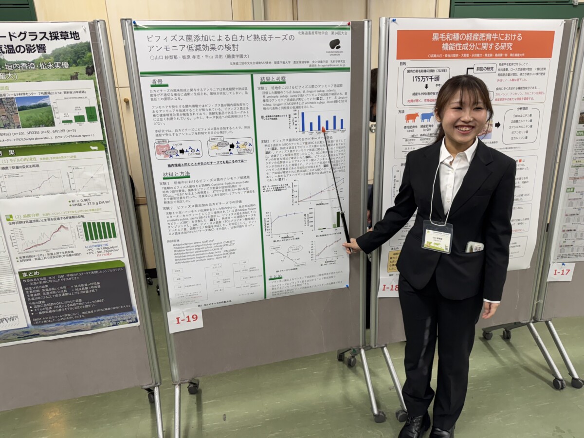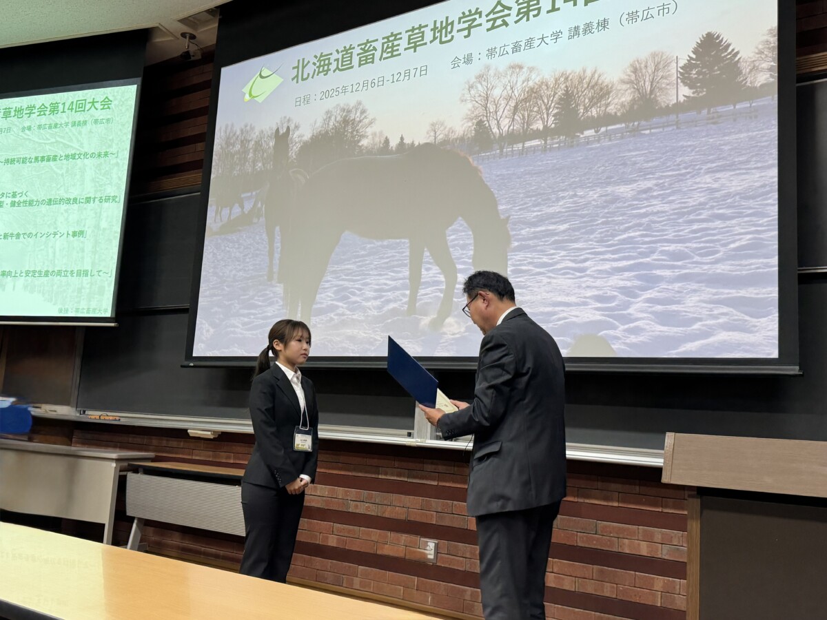 2025年12月6日(土)・12月7日(日)で開催された北海道畜産草地学会第14回大会において、本学食と健康学類4年の山口紗梨那さん(乳科学研究室)がベストプレゼンテーション賞を受賞しました。